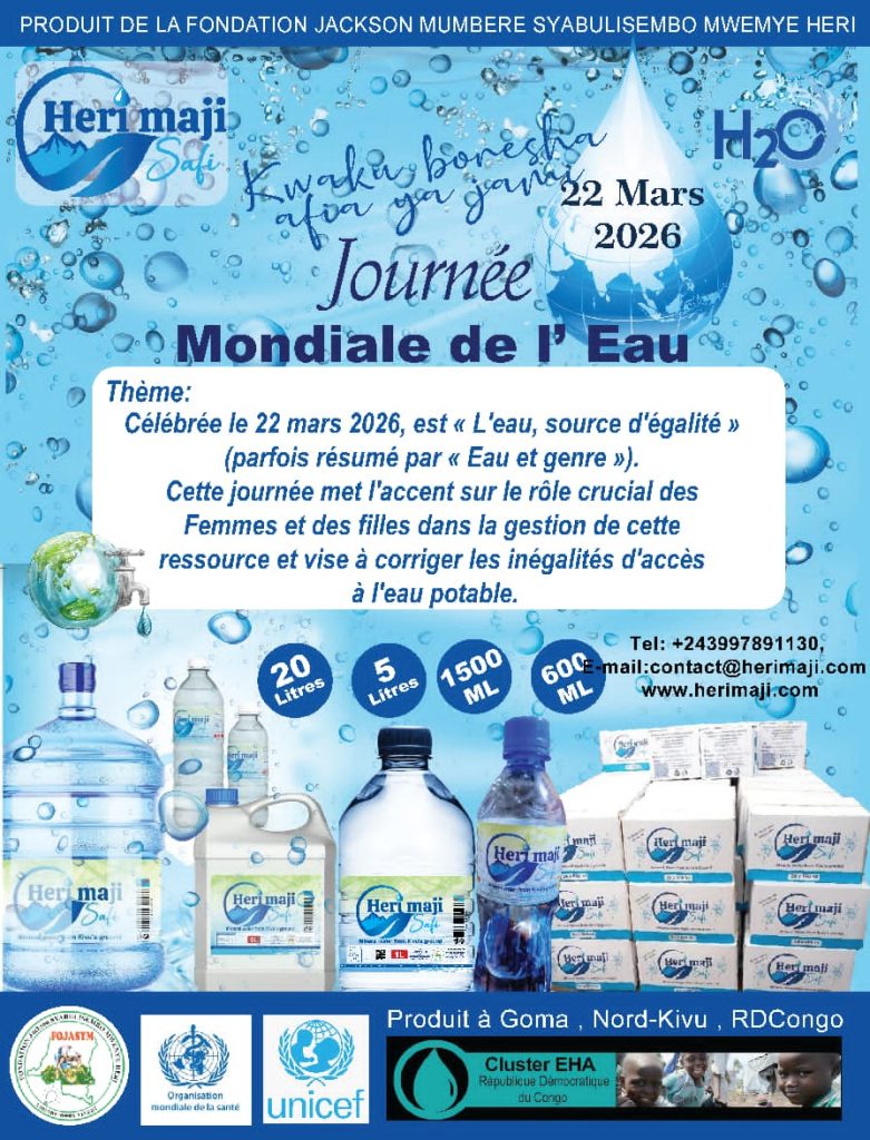 « En ce jour dédié mondialement à l’eau, Heri Maji Safi DRC adresse un message de solidarité aux populations déplacées de guerre du Nord-Kivu, de Ituri et du Sud-Kivu, pour qui l’accès à l’eau est une lutte quotidienne, alors qu’un droit humanitaire fondamental, » indique l’ingénieur Jackson Mumbere Syabulisembo Mwenye Heri, Patron Directeur Général (PDG) de l’entreprise Heri Maji Safi DRC et Manager Régional du Cluster World Publics Wash EHA, dans son message à l’occasion de la journée du 22 mars dédiée à l’eau.